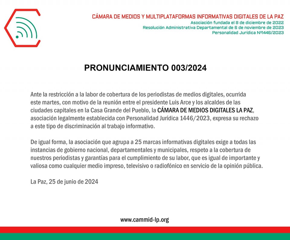 Noticias de la Asociación Cámara de Medios y Multiplataformas Informativas Digitales de La Paz